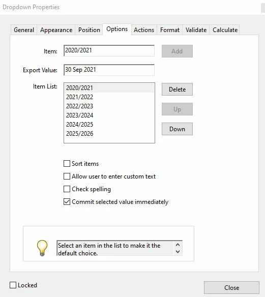 I am attempting to create a PDF membership form for my sports club and am stuck on one thing. I have a dropdown "MemYear" that is set with options "2020/2021", 2021/2022, and so on. When you select 2020/2021 it exports a value of "30 Sep 2020" to "TEXT1", 2021/2022 exports "30 Sep 2021" and so on/ If it is possible, I would like it so that in addition to the first export to TEXT1 it will also export "December 2020" to TEXT2 and when I select the next option it would export December 2021 and so on.