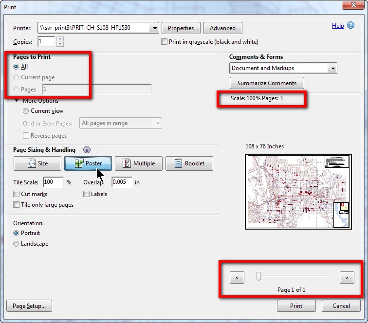 I would prefer not to print the entire length of each tile for this purpose. However, when set to "Poster", while the scaling note indicates it knows there are 3 pages (i.e. tiles), the print selections only see the entire document (see image below).