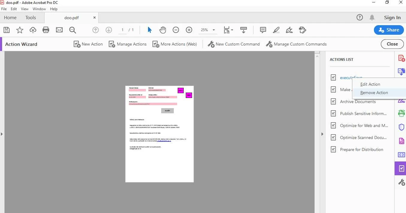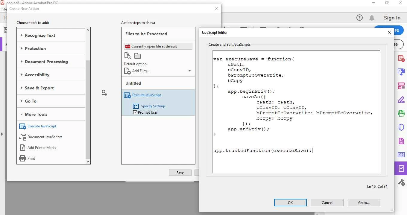 The function works well, but one thing strikes me: it's not enough to just reset the app, I have to clear the named action button and only then can I run the function in the button without any problem. The trouble is also that although the action button has disappeared, I have no idea where to find the code in Acrobat where the privileged function is located. Even after resetting Acrobat the privileged function still exists in the system. As I hinted in the introduction, I don't have access to Acrobat folders, so I'm wondering if it's possible to find all the functions I've wrapped in app.TrustedFunction() somehow through the UI?