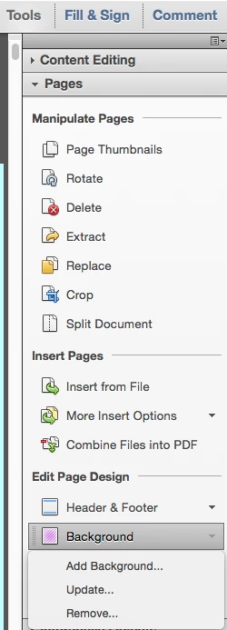 I have a pdf in Adobe Acrobat XI that I want to change the background on a couple of the pages, just to make them stand out a bit. I have done everything I've been told through Adobe Help and on various websites and nothing works. Is there a setting in the program that I need to check. I've even tried extracting the pages in hopes of changing the background and slipping it back in the doc. Nothing is working. What am I doing wrong?