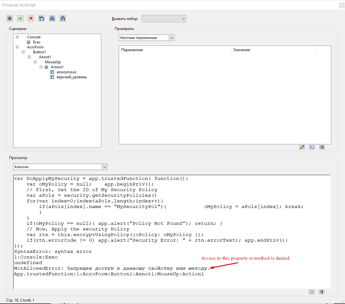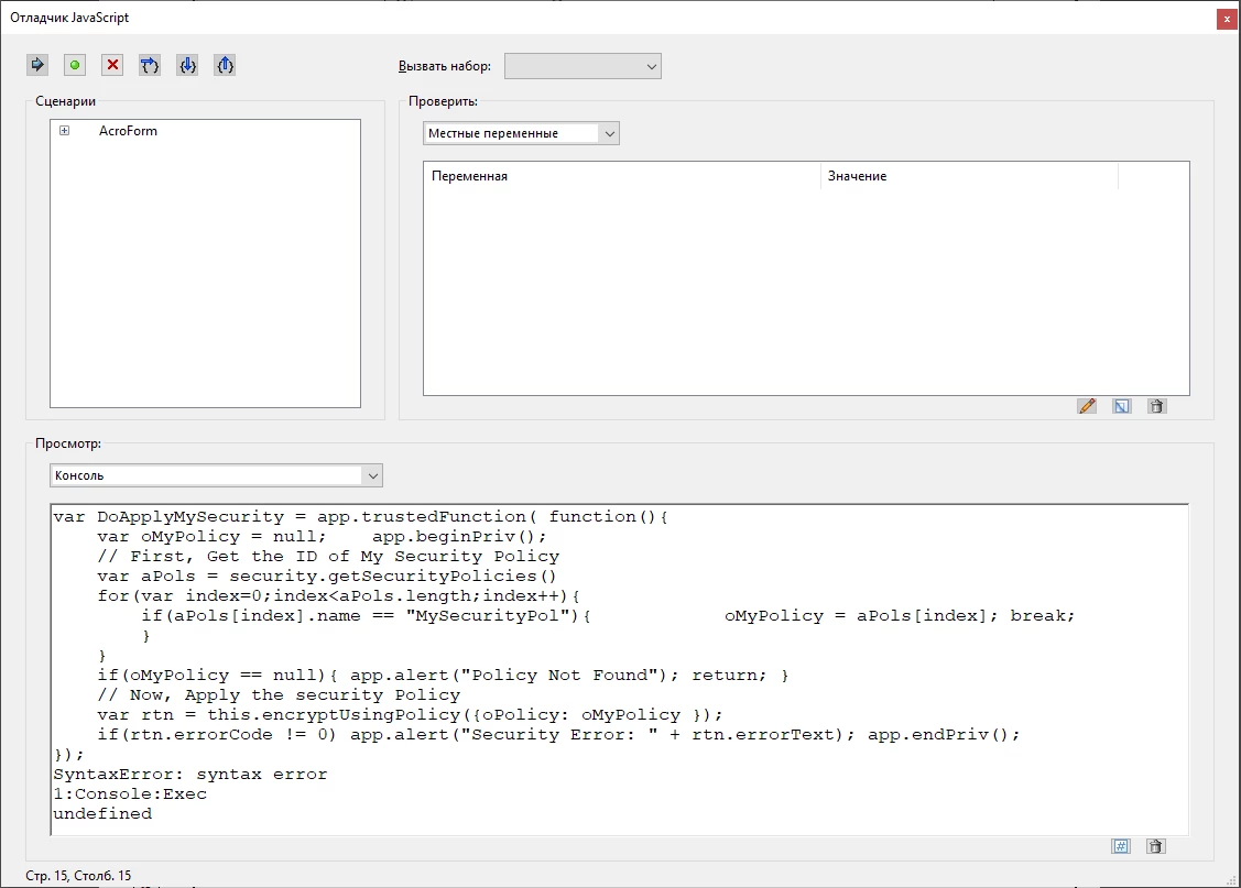 Pre-created a protection policy with the name "MySecurityPol", and run this code from the console in Acrobat Pro DC, but there is a syntax error! What am I doing wrong?