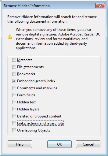 "Remove Hidden Information" that has as one of its options "Embedded seach index"
