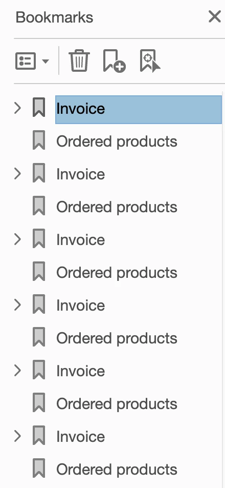 As you see there are two top level bookmarks in each invoice, I'm trying to figure how to remove all the "Ordered products" bookmarks with a script, so that I could use the Split function to split all 300 invoices by Top Level of Bookmarks.