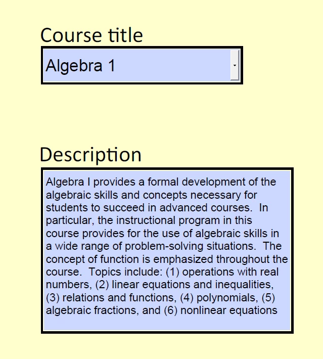 I wish it was as easy to create as it to draw a picture of it! If the user selects "Algebra 1", for example, a specific description would display below. There are lots of courses and lots of descriptions, and the descriptions are pretty long (as shown). It isn't necessary for the user to make any changes in the description -- in fact that would be terrible. But I would like for them to be able to copy text from it and paste that text into another text box on the same page.