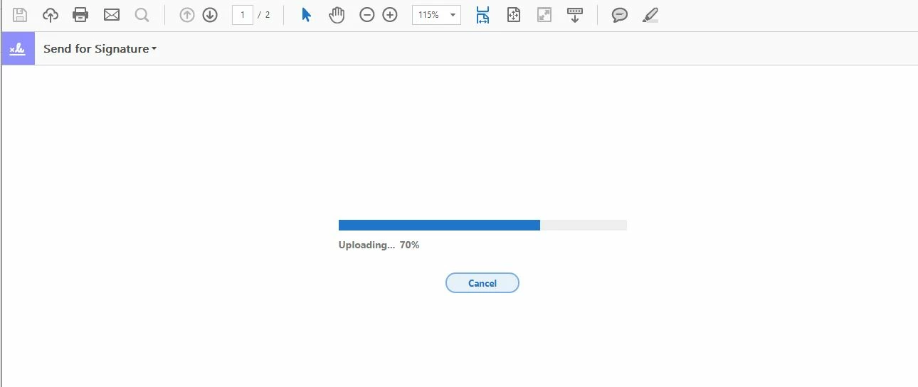 I am trying to use the send for signature function. At the 'upload' stage before you input the Signer email the upload hangs at 70%. Was working perfectly 9hrs ago. Internet connection is perfect. Tried in Adobe Acrobat Pro DC and Acrobat Reader DC. Windows 7.