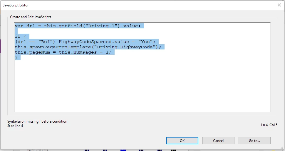 I'm working on creating a form in Acrobat where the user (who will be using Reader) will select from a group of 5 radio buttons. 3 of these choices/radio buttons need to spawn and go to a page where they provide more detail. I've figured out how to use templates and spawning to have a template page hidden until the user clicks on one of the radio buttons and then go to that page (last page) using this code on each of the 3 radio buttons: