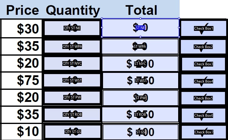 Hi, I have minumal experience in Java/coding, but understand the basics due to some programming classes I've taken in the past. I'm making an order form that a customer can change the quantity entered and add it to their order with a Checkbox. There is a suggested quantity that will already be entered. I have managed to create multiple Text fields with a script to calculate the price(Total) that is activated by a Checkbox. Next to each Text field is the Checkbox that turns the field "Off" or "On". It works fine with one, but I have 7 and each time I enter a new calualation in a new, unrelated field, it randomely cancels out the some of fields above it. See below. All are checked, so all should have the Total price entered.