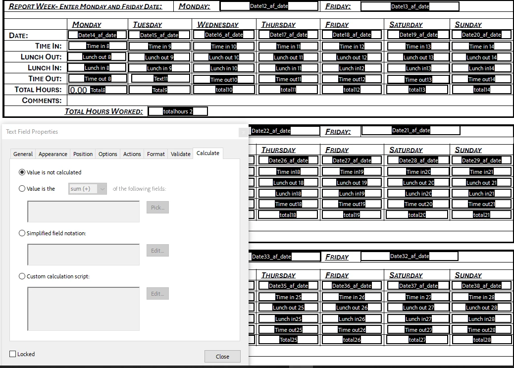 I'm very new to trying to add calculations to a PDF fillable form, and I have a timesheet that has the days of the week with Time In, Lunch Out, Lunch In and Time Out sections for each day, along with the total hours for the day and week in their own boxes. I need to know how to add in whatever is needed to get it to calculate if that is possible. This would be a form I have to send out and auto-calculate for the employee. I have added a screenshot of what I am referring to below. Im not even sure if im trying to add these into the correct spot. I have read multiple other posts, but I'm just to new to understand them fully and can't find a good video. If there is any help or suggestions on what I need to do to make it work, please let me know, and pleasebe nice,Im trying to learn.