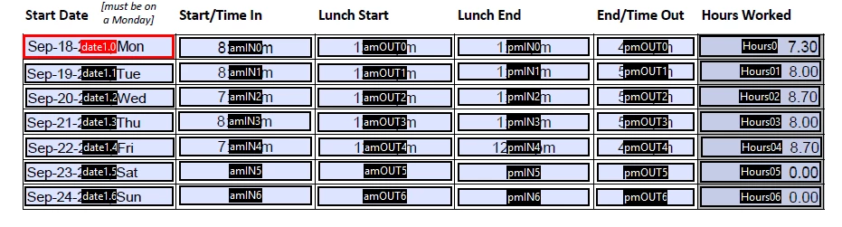 I have four fields [amIN0, amOUT0, pmIN0, and pmOUT0] that will auto-populate the Hours Worked field.