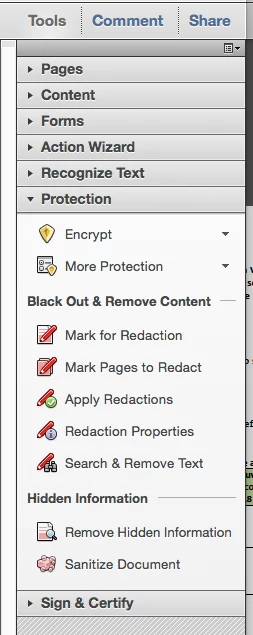In Adobe Acrobat Pro (10.1.1), I click on “Tools” to reveal “Pages,” “Content,” “Forms,” “Action Wizard,” “Recognize Text,” “Protection,” and “Sign & Certify.”  When I click on any of those, the small triangle arrow turns to indicate a sub menu is present, but no sub menu appears.  Please help me fix that.  Operating System: Mac OS 10.10.5