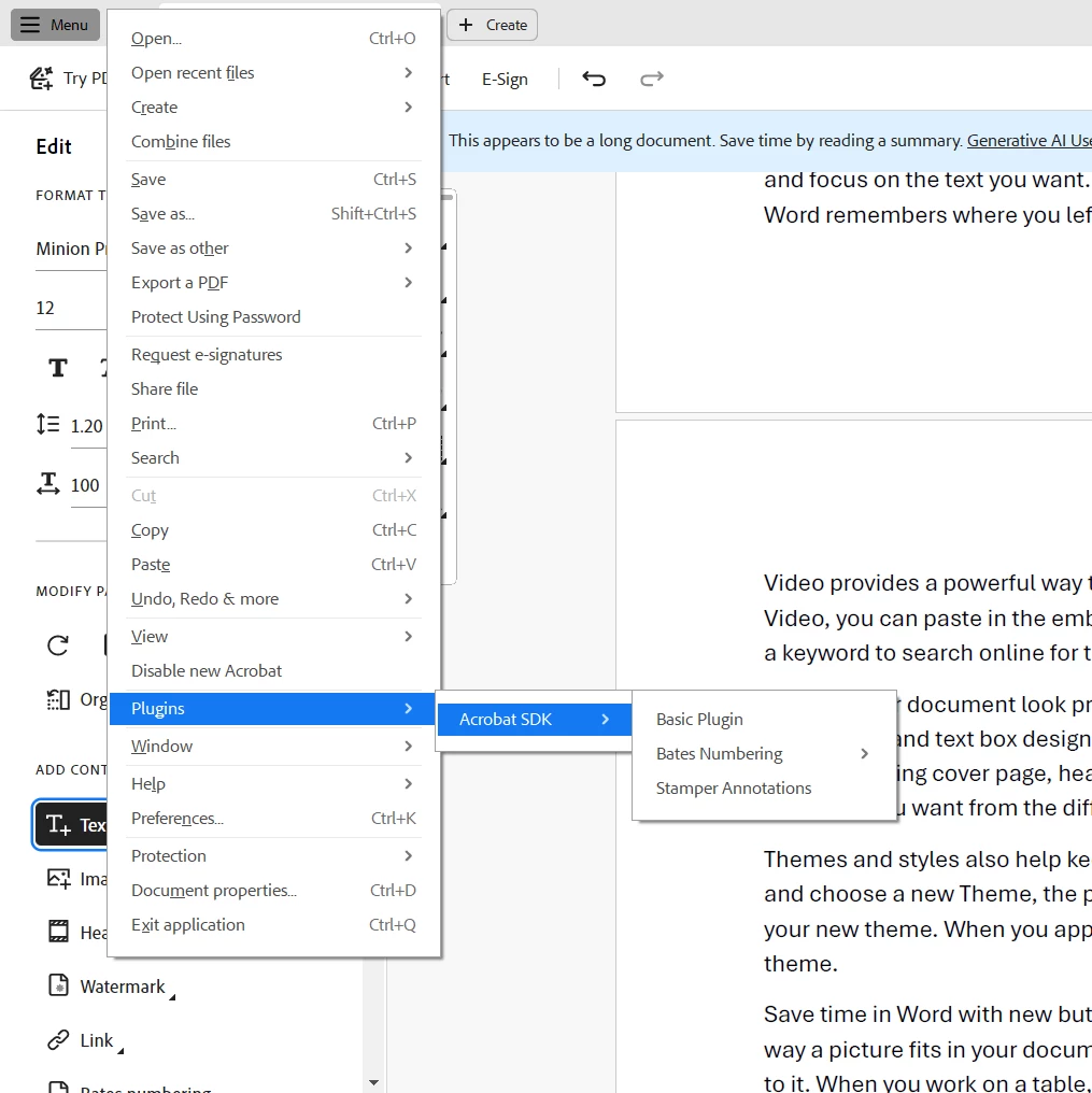 I was building a plugin for acrobat pro that adds a button to the edit toolbar and the button calls a function to add annotation to the selected text. I am using the Basic Plugin as my base and making changes to the BasicPluginInit.cpp file. I tried to replicate what I saw in the documentation here-