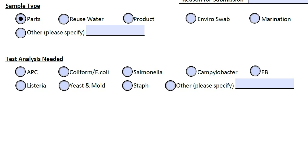 For example, selecting PARTS would default the Salmonella, Campylobacter, and EB testing radio buttons on..