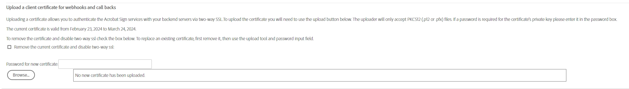 Hi, we are currently trying to implement webhooks as part of flow to update approved quotations in our system. We've run into issues with the setting to allow 2-way ssl which does not appear to return any certificate in a typical location in our C# Backend Application. httprequest.connection.clientcertificate is not populated and there is nothing immediately obvious in the headers. We also tried not returning the same cert in our response and Adobe accepted our response rather than failing on initial creation.