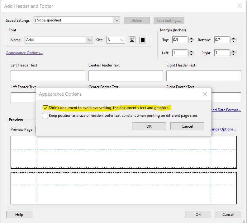 I have an "Add Header & Footer" step in my Action Wizard step which is meant to ONLY shrink the document (this was my creative solution to add an action to merely shrink documents but not really add a header or footer (which I leave blank with the "Prompt User" box unchecked)). However, depending on the document, it sometimes removes the header even though it is only supposed to shrink the document and leave the header untouched. I am running Adobe Actrobat Pro on Windows. See images below.
