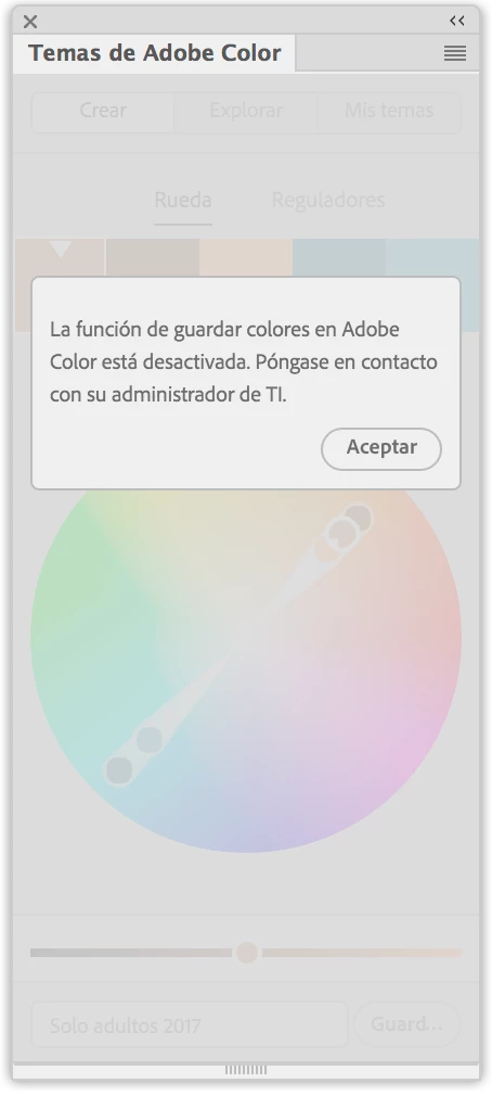 "La función de guardar colores en Adobe Color está desactivada. Póngase en contacto con su administrador de TI" which you can roughly translate for: