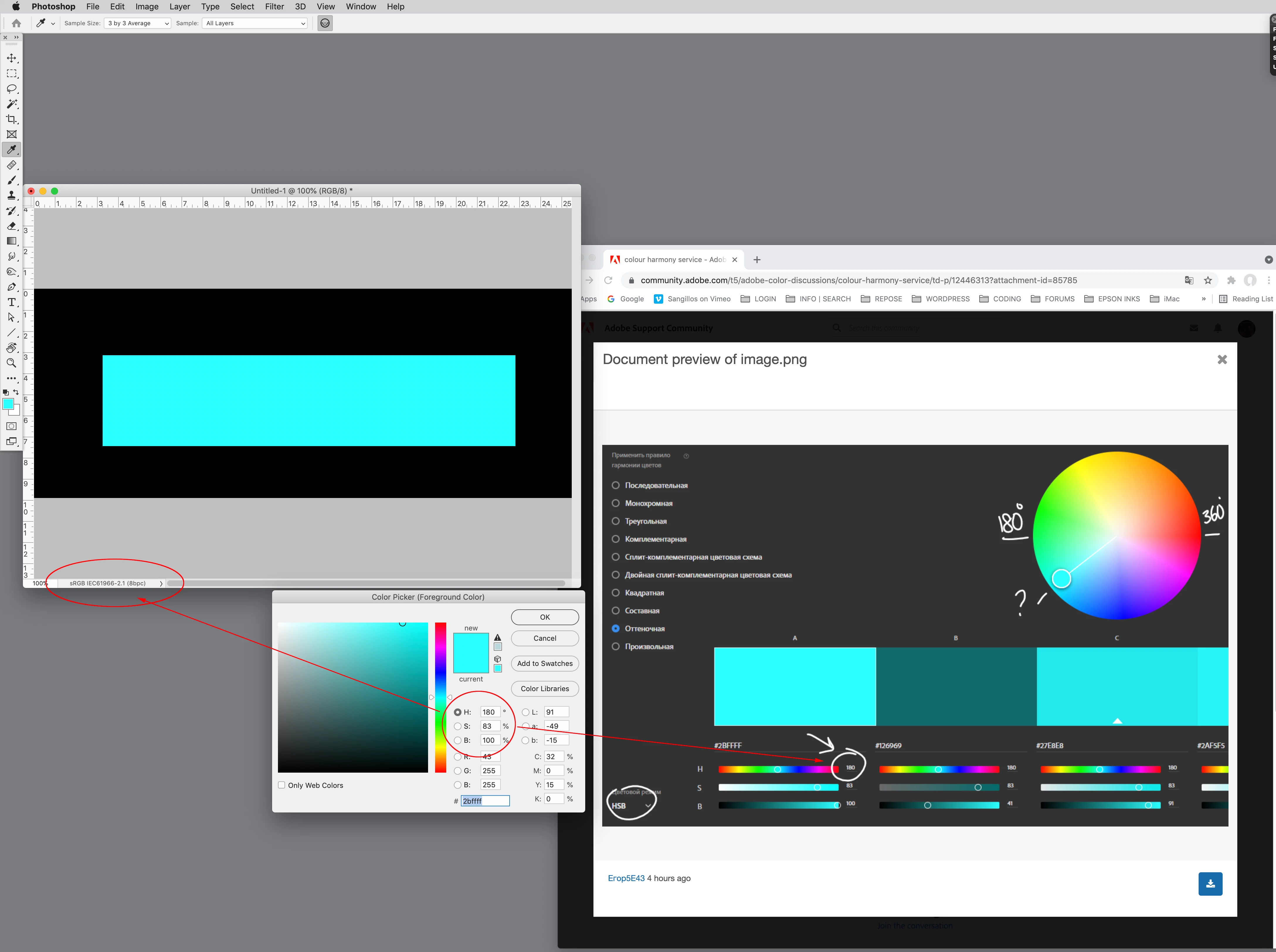 Selecting Hue 180 degrees I should be exactly opposite red (as red Hue is 0 or 360 degrees) and should see green, but I get thrown to cyan...and it's clearly not a 180 degree circle.