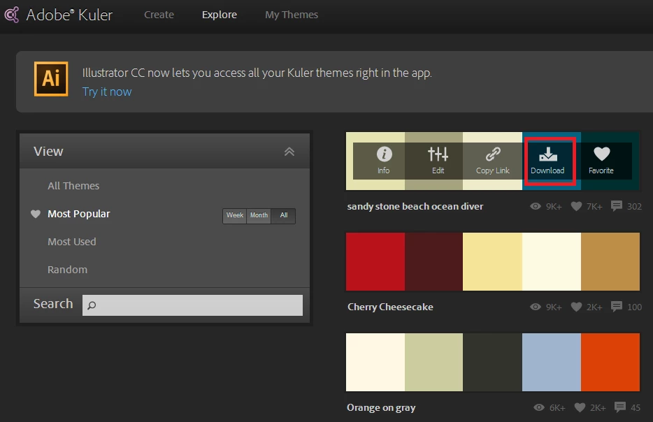 For users who prefer to explore and browse themes created by members of the Color community first, we recommend using the web site—where you will find robust search, filter, and browsing capabilities. Once you find something you like, simply mark it as favorite and then refresh your Color panel in Illustrator.