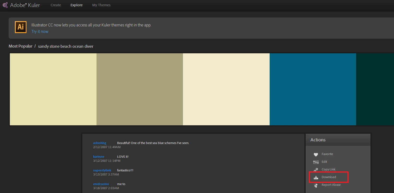 For users working on older versions of Adobe software (CS4, & CS5), Color themes can also be downloaded for use in Adobe software using the Adobe Swatch Exchange (.ase) format. To download a theme from Color, first make sure you’re signed in. Click on the theme you’d like and click Download. This downloads the theme as an .ase file to the location of your choice.
