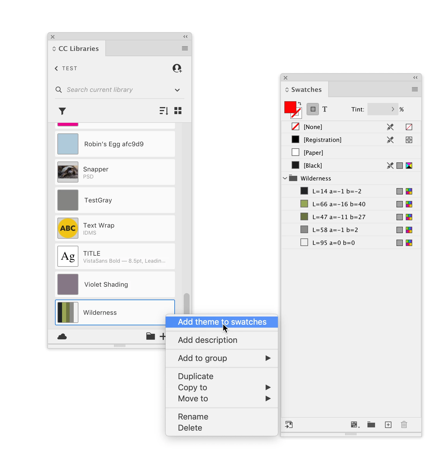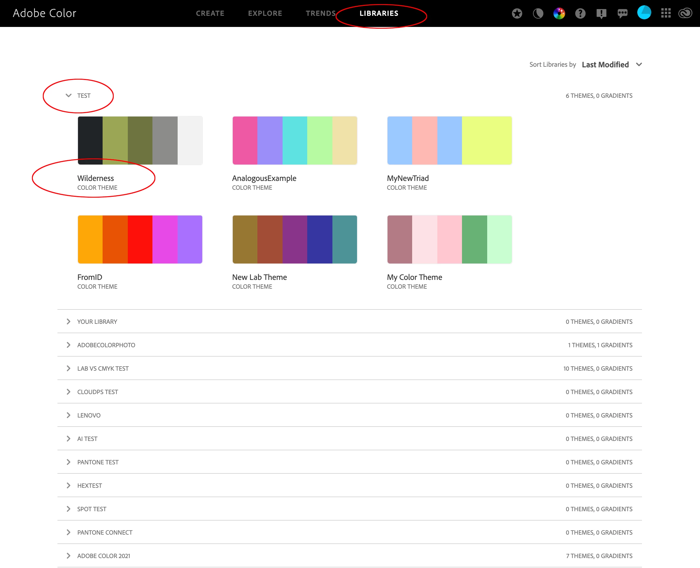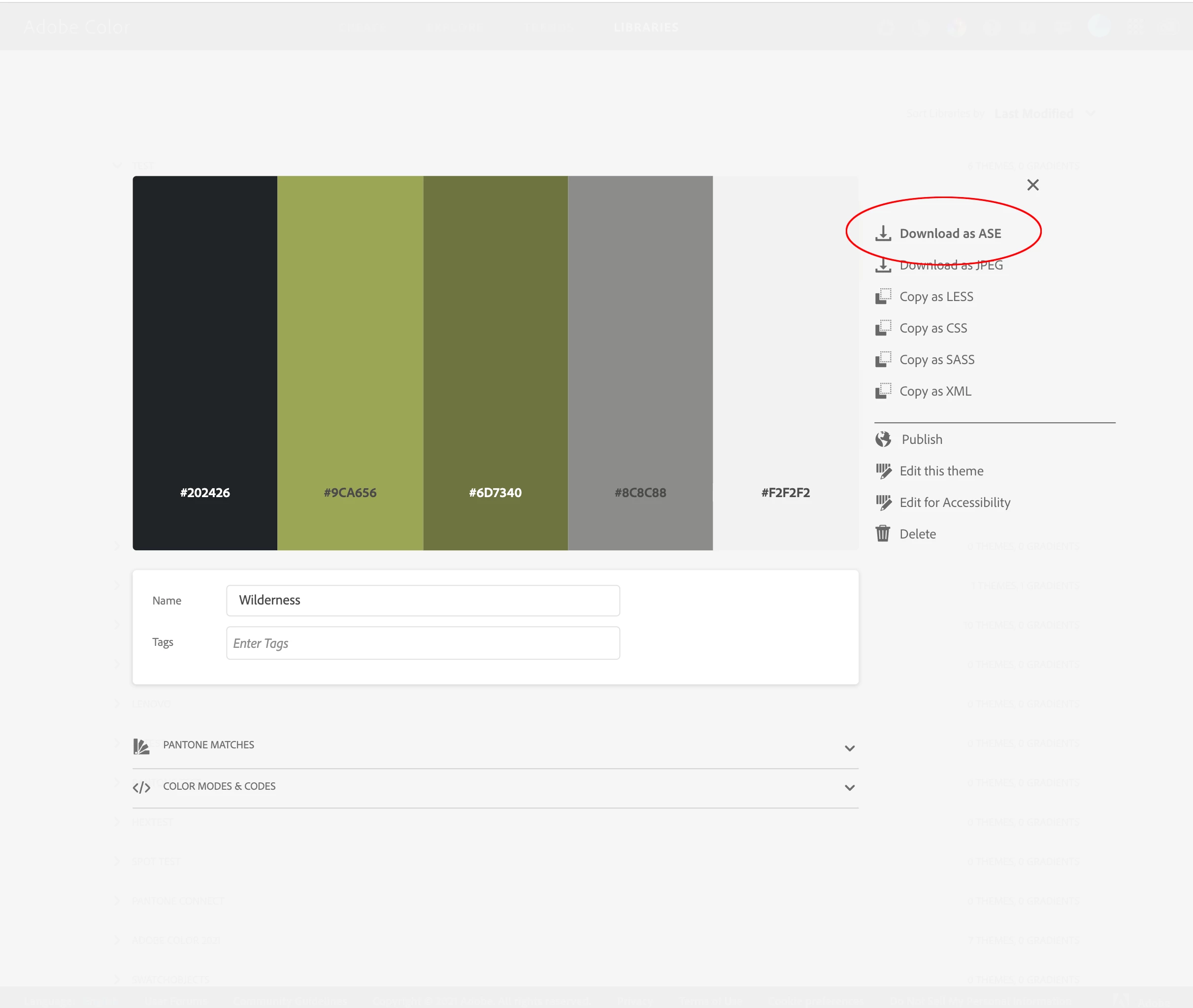 If for some reason your saved theme isn’t showing in your CC Libraries panel, there is an option to download a theme as an .ase. Choose Libraries from the Adobe Color menu, navigate to the saved theme and double-click. Here I have save a theme named Wilderness into my Test folder: