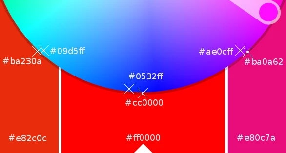 Above you see a part of a screenshot of the new kuler main page with color values pasted into it. The colors of the scheme being designed is what a designer wants to see. Proportions of color blocks are one important thing to keep in mind. How the colors act against each other is the second. Both is missing from the new kuler: I don't just see red #ff0000 act against darker red #e82c0c, I see red covered by a changing color wheel and acting against the frame of the wheel in dark red #cc0000 and blue #0532ff. That's too much, it's disturbing - it's actually so disturbing that I've stopped using kuler. Similar, I can't just concentrate on the bloody red and dark red - because of the thick white border. If I wanted to see the flow the colors are making whet they pass on to another - I can't, because of the border.