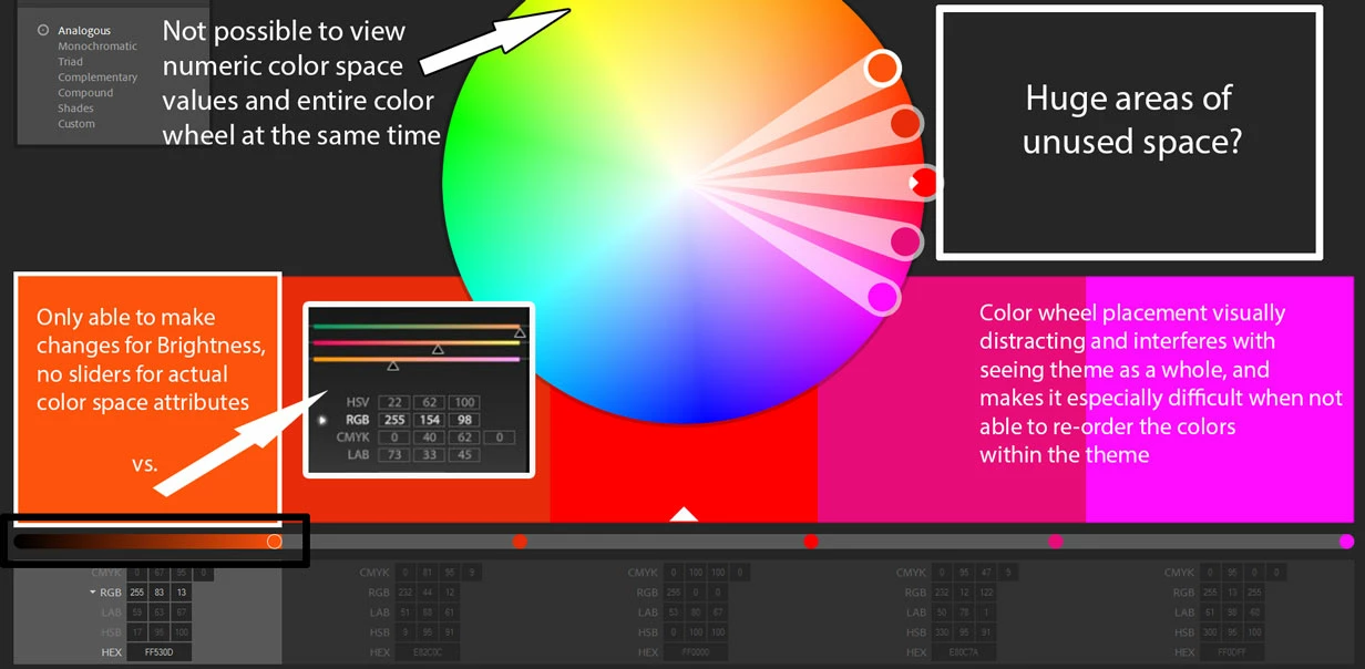 I'm not opposed to the new UI just to be resistant to change.  The wheel is covering up the tiles big time and introducing inconsistent colors to the scheme, the ability to see interactions is taken away, and the ability to fine tune the sliders has been removed.  This is a major step backwards in functionality with no new benefits being enabled other than the wheel as a crude selection adjustment tool.