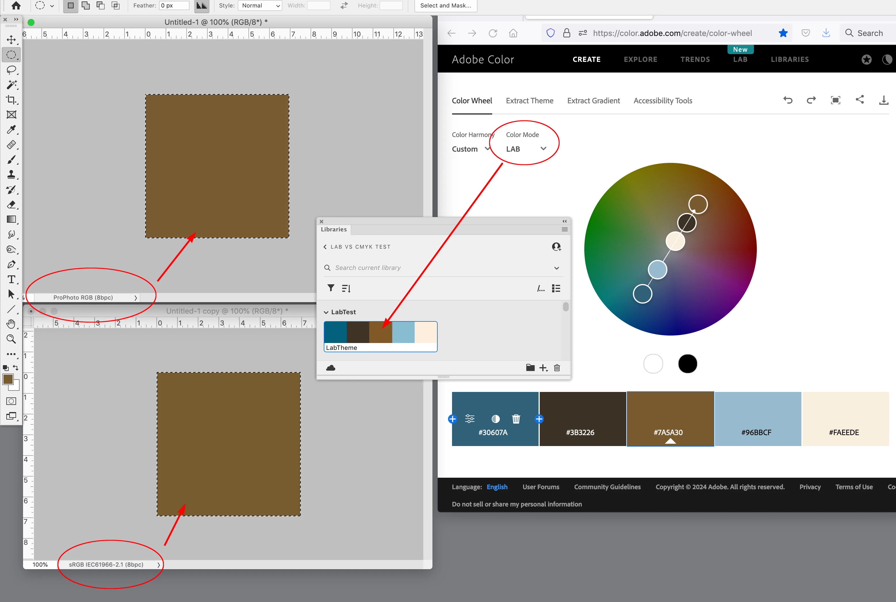 When I find a color I like in the Adobe Color Wheel (https://color.adobe.com/create/color-wheel), I like to pull it over into PS as a solid fill layer for color grading. However, I notice a sometimes significant shift in the color. I know the internet is in sRGB and my image in PS is in ProPhoto. What color space does the adobe color wheel refer to? Or why do I see a sometimes significant shift in the color? Or maybe I'm just doing something wrong. I use the eyedropper on the adobe webpage, find a color I like from my image and then create a color scheme from that image. Then, I copy the new colors I like into solid fill layers for color grading.