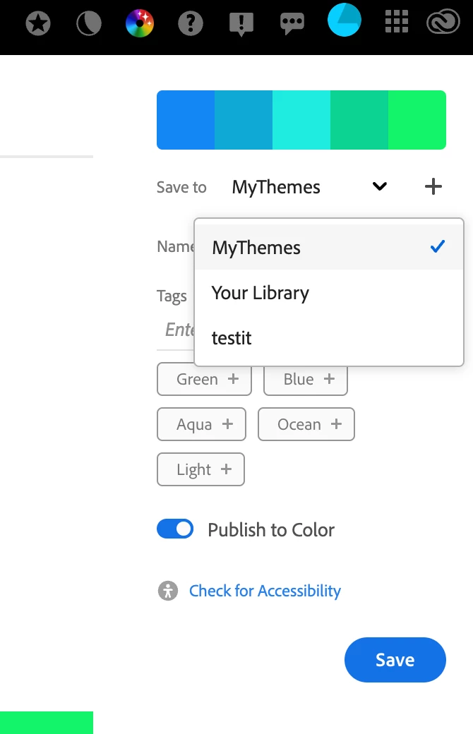Wie kann ich Farben von Color.Adobe.com in eine bestimmte Bibliothek einspeichern?