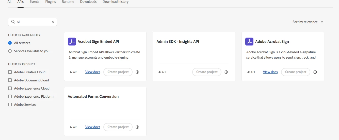I have license of Free Trial but when i am using developer console and adding project to it after adding it. i am not able to see the Acrobat SignIn api services available to me.