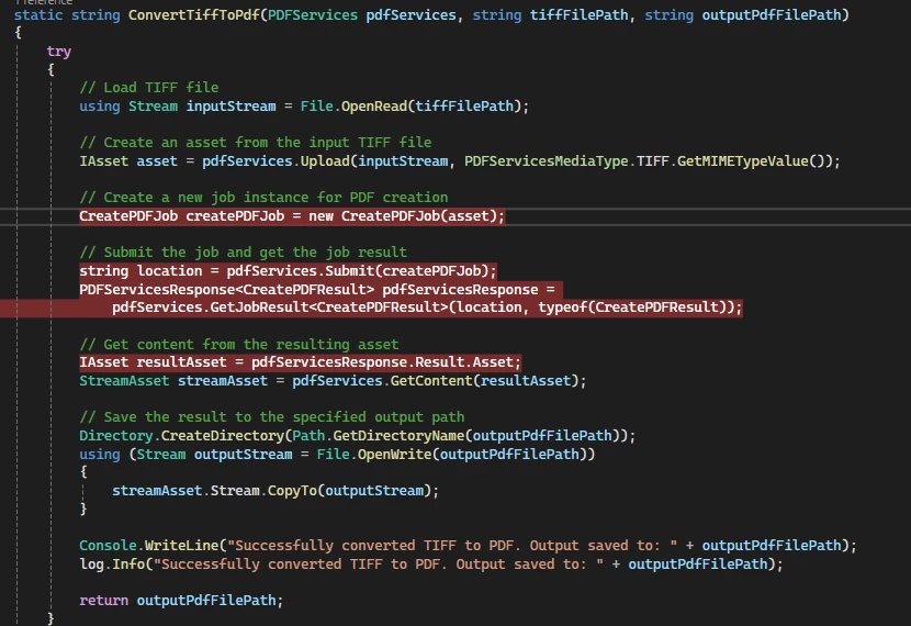I have implemented a .NET console application to convert TIFF files to PDF, and it works fine for small files. However, when I try to process a 20MB TIFF file with 86 pages, I encounter an internal server error.