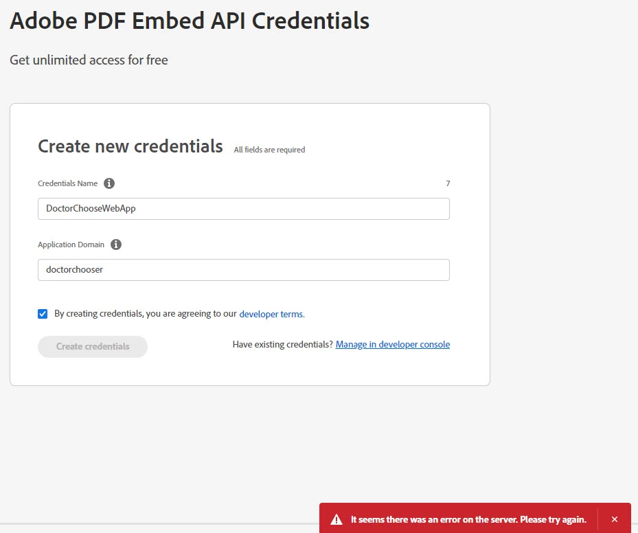 TBoonsParticipantForum|Forum|2 years agoJune 7, 2023QuestionAdobe PDF Embed API Credentials without the .comForum|Forum|2 years agoJune 7, 20231 reply444 viewsWe have an internal app, lets call it 'Doctor Chooser'. All the users use Chrome and goto 'DoctorChooser' as the URL. I am unable to register this as the Application Domain (DoctorChooser) to get an API key.Anyone have any ideas for a workaround? PDF Services APIPDF Extract API
