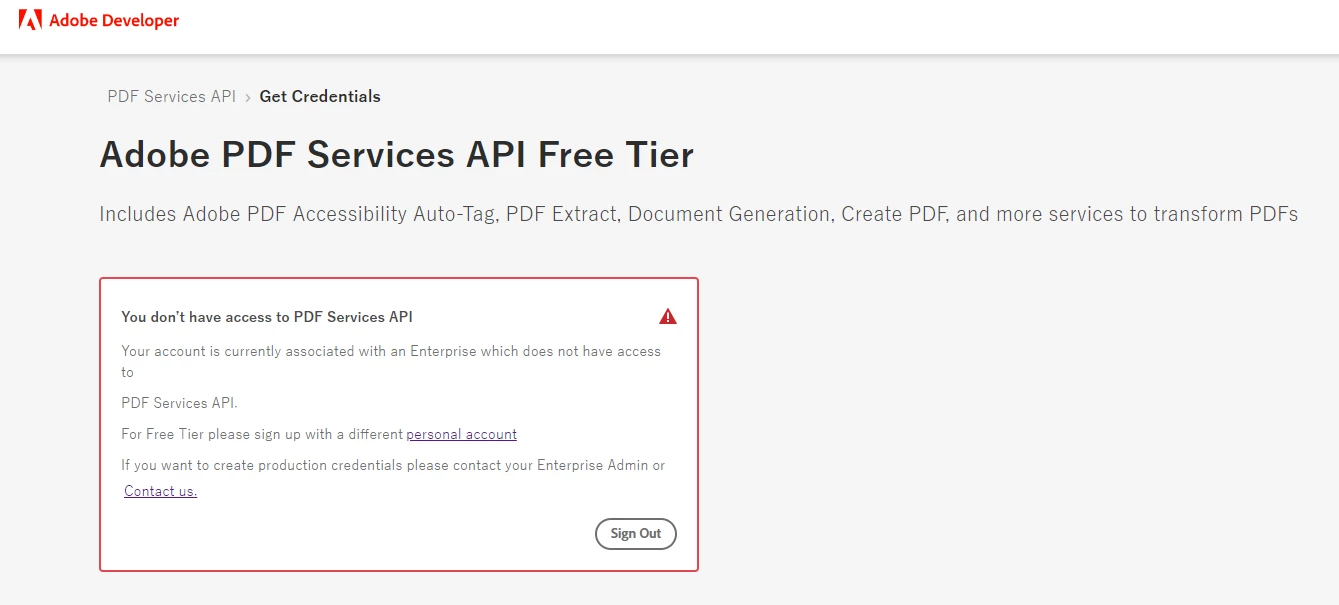 You don’t have access to PDF Services API Your account is currently associated with an Enterprise which does not have access to PDF Services API. For Free Tier please sign up with a different personal account If you want to create production credentials please contact your Enterprise Admin or Contact us.