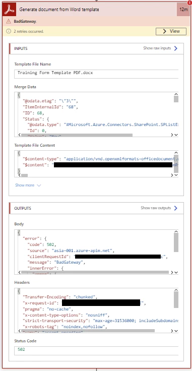 Bad gateway on "Generate document from Word template" connector in Power Automate
