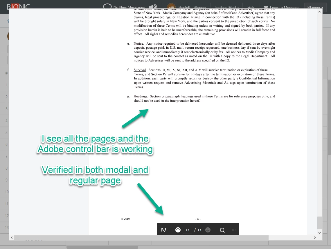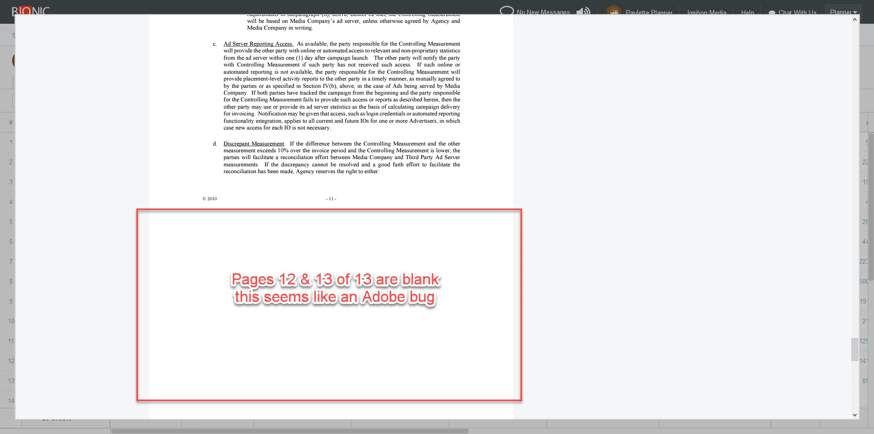However, we are encountering a problem on longer documents. The first pages appear fine. After some point, the pages are blank. For example, I have a 13 page document. I see pages 1-11, but 12 and 13 are blank. Oddly, if I hit the page down button a number of times (side note: the page up/down is glitchy), pages 12 and 13 will eventually appear. Below is a screen shot.