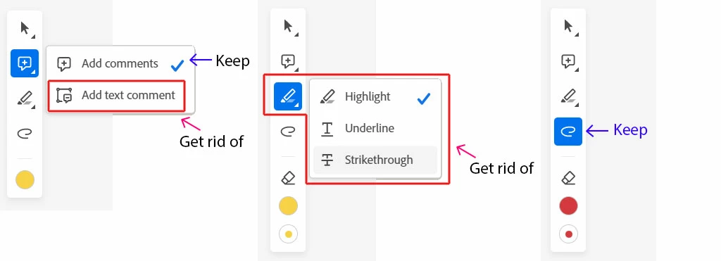 After some testing we found out that our end-users didn't want/need a couple of the annotation-tools -- they only made things confusing. Anyone know how to get rid of the "Add Text Comment" item, and the "Highlight Text" group (entirely)?