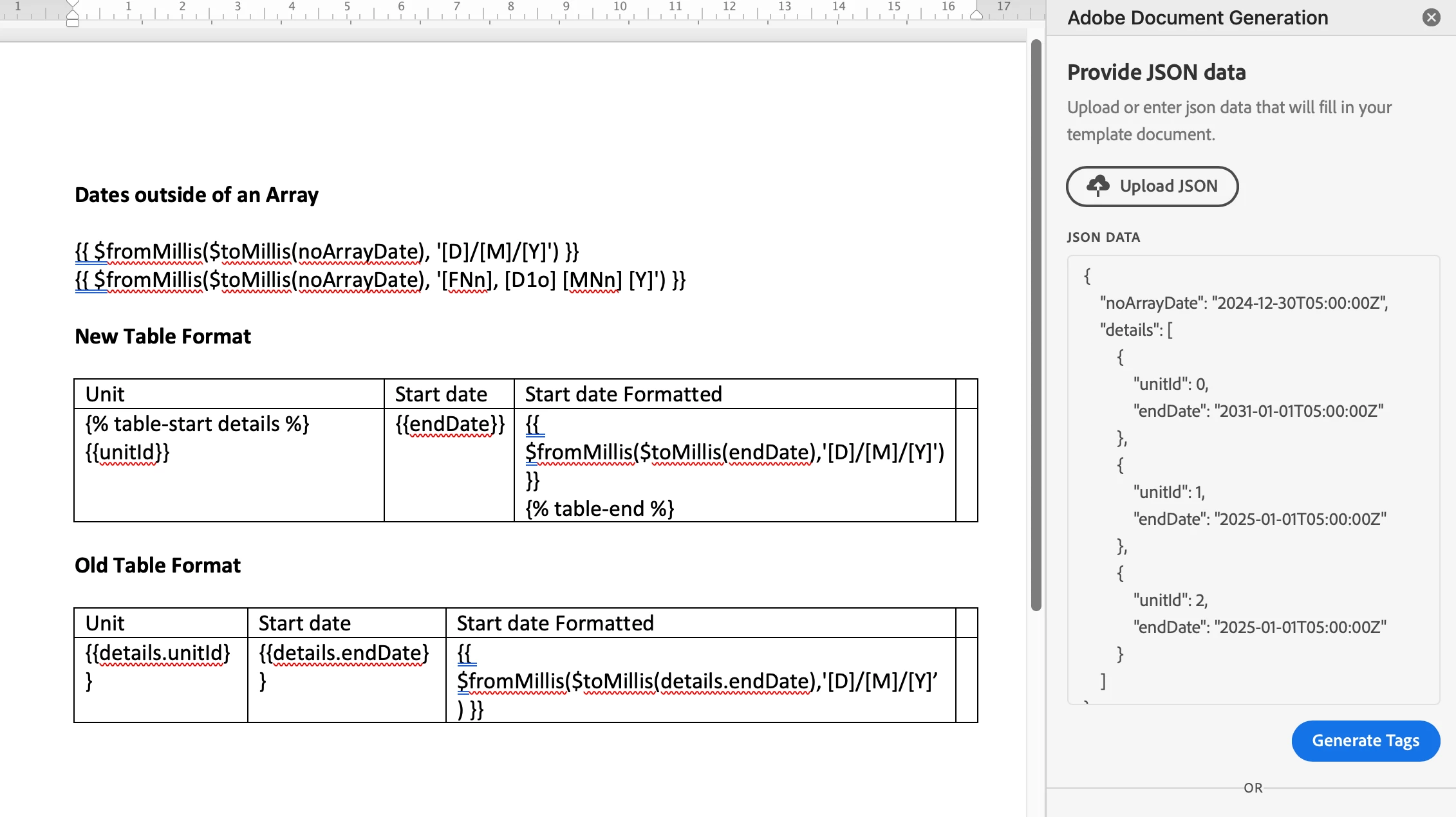 This apporach works with dates in the JSON object that are not in an array. If you try to do this using the old table format or new table format, they result in an unexpected result.