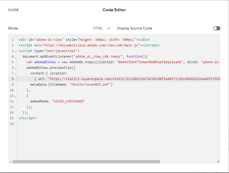 I am trying to add the PDF Embed API code to our website but I am receiving a file preview error. I am 95% sure the issue is that the file location of the .pdf is a squarespace.com link and my website, obviously, sits on its own domain. Is there a fix or workaround for this?