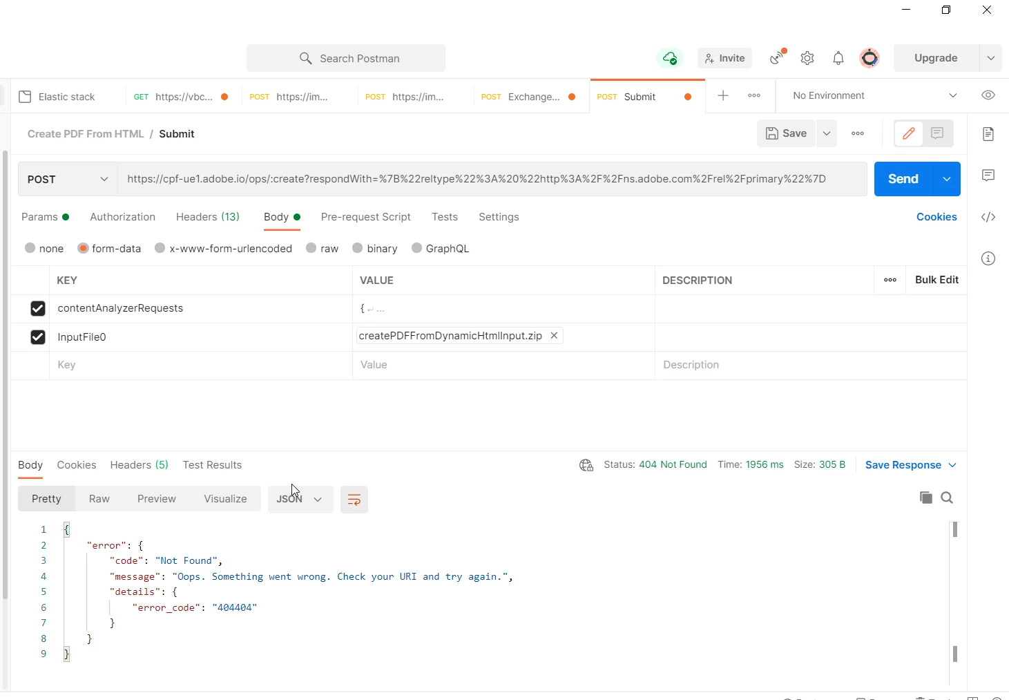 I'm using the Create PDF from HTML API on postman and receiving the 404 message. Not sure what's wrong with the PDF. Able to get the access token and replaced on authroization.