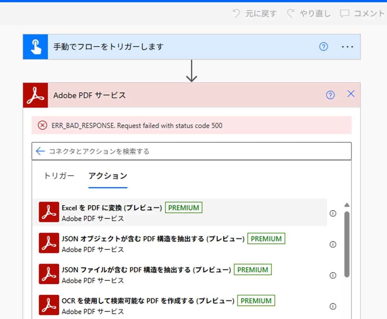 I've been using the Adobe PDF connector without issues until recently, but now I'm unable to add or edit actions. When I try to add an action, I receive the following error message: