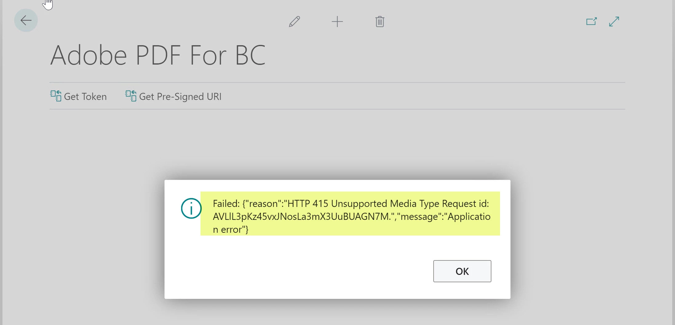 Failed: 415{"reason":"HTTP 415 Unsupported Media Type Request id: [ID].","message":"Applicationerror
