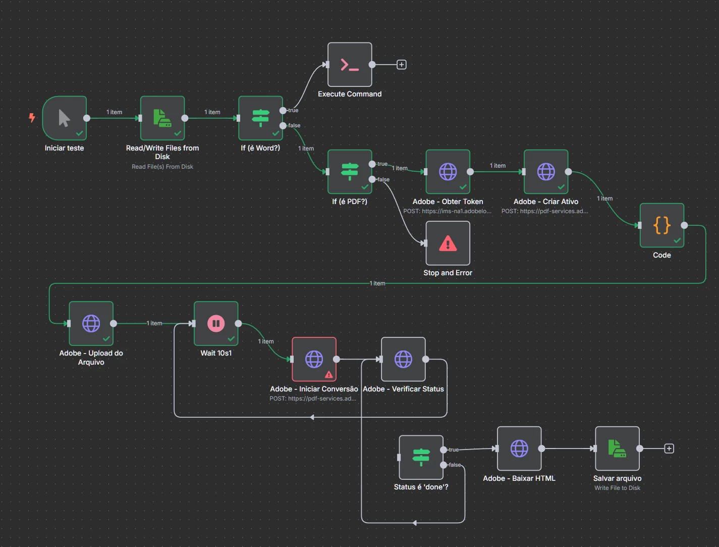 The Problem: My workflow consistently fails at Step 3 (Start Conversion). The node Adobe - Iniciar Conversão receives a 404 Not Found error from the Adobe API.