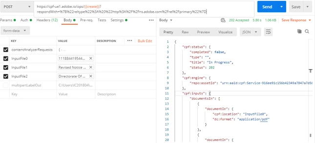 I was trying to Combine multiple PDF files into a single PDF File, using PDF Tools API.Be;ow is the URL. https://documentcloud.adobe.com/document-services/index.html#post-combinePDF.