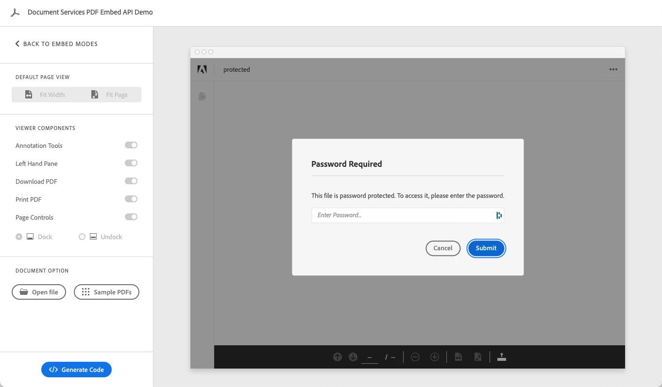 I am able to view PDF using the "view-sdk" or embedded pdf viewer library (not sure of the name). However when I try to load a password protected PDF, it displays nothing on the page and does not prompt for password. Is there a way to view password protected PDF's using the embedded api?
