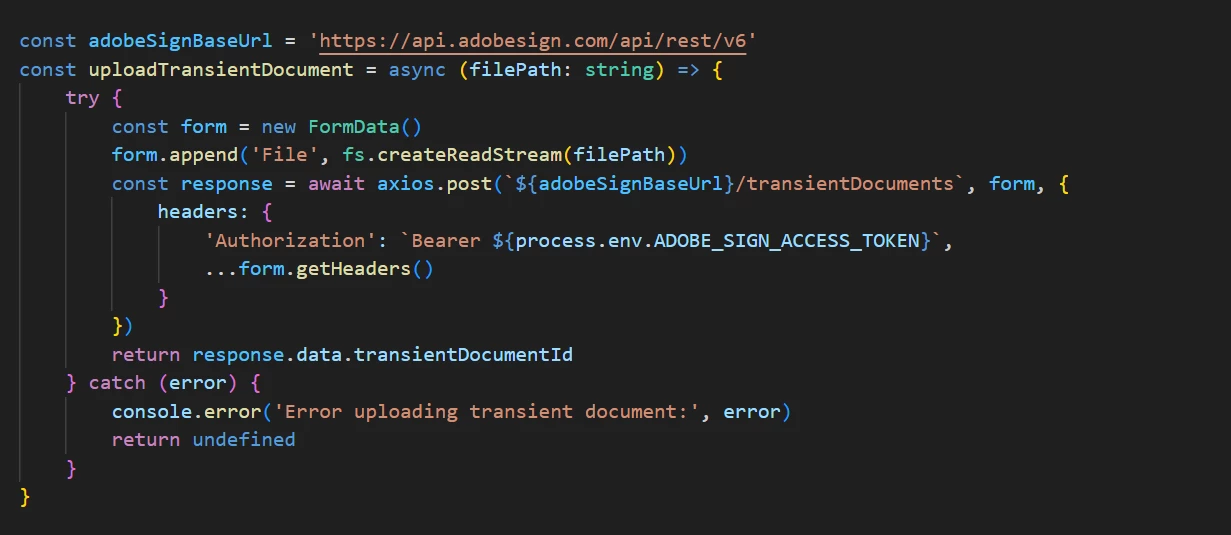 PPravangshu390226571tnwParticipantForum|Forum|1 year agoAugust 6, 2024QuestionINVALID_ACCESS_TOKENForum|Forum|1 year agoAugust 6, 20241 reply361 viewsWe want to integrate Adobe Acrobat Sign service to a project.Problem: Access token provided is invalid or has expired.Even using a newly created access token, issue exists.API Endpoint: /api/rest/v6/transientDocumentsAcrobat Services: PDF Services APISecurity digital signatures and esignaturesGeneral troubleshootingJavaScript