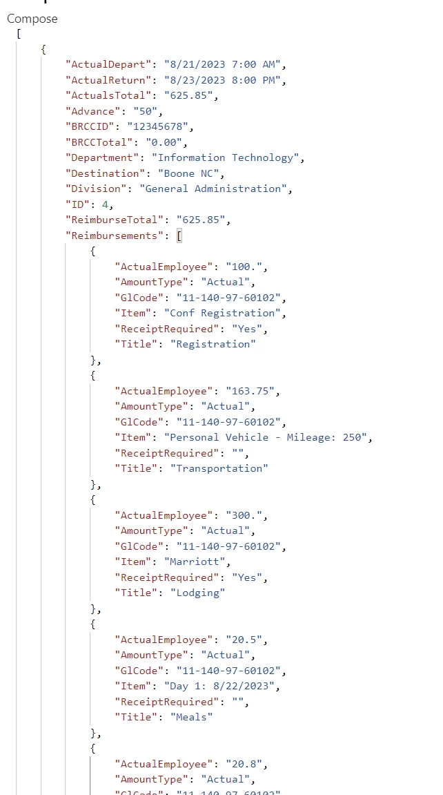 I am building a power automate flow to take information submitted in a power app and create a pdf that can be sent for signatures. I keep getting Invalid Parameter errors when I get to the "Generate document from Word template" action. I have converted practically all my JSON to strings. After I parse the JSON in the flow, it all looks fine (see screenshot below). I use a compose action before the "Generate document from Word template" action because if I manually build the merge data, my nested data is not available.