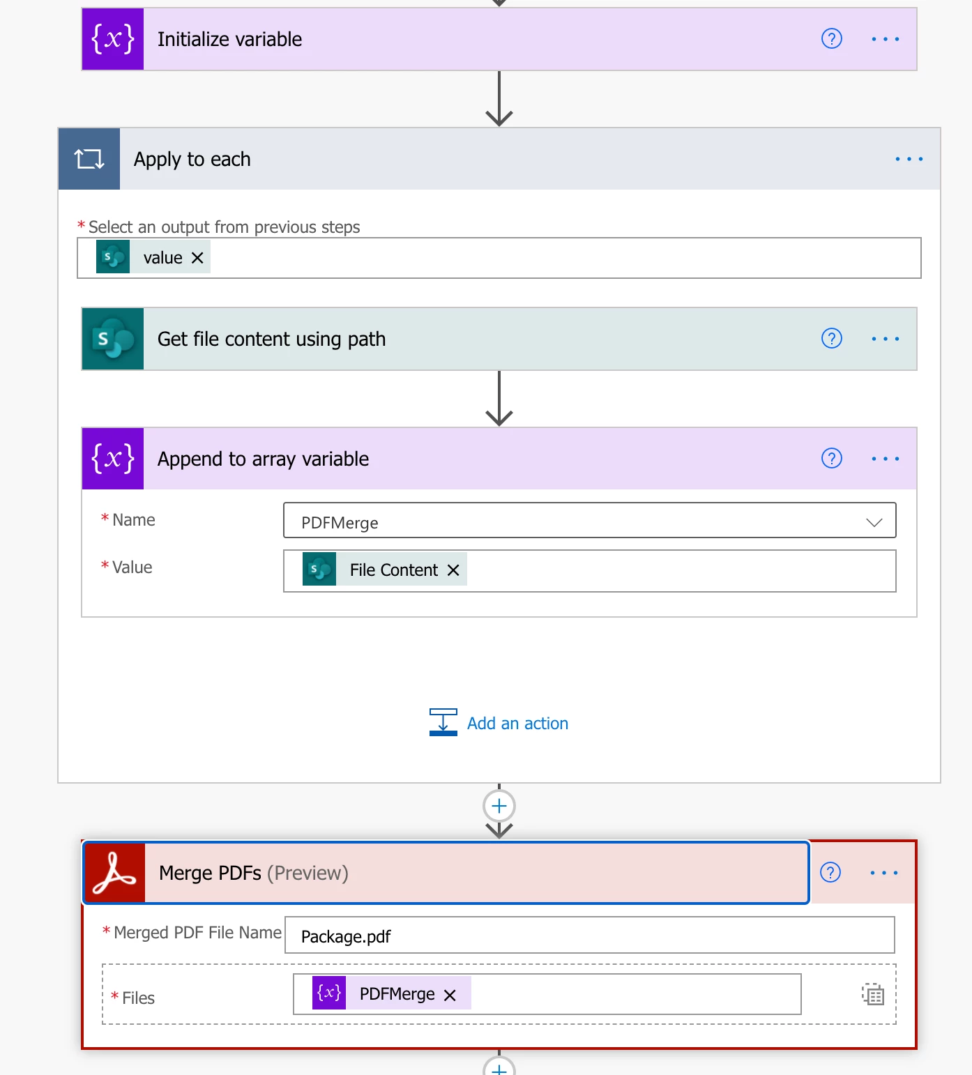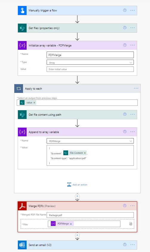 I have a Sharepoint folder with several PDF files within. I would like to collect the file content from each of those files, create an array variable with the merged file content, and then pass that variable into the Adobe Merge PDFs array input.