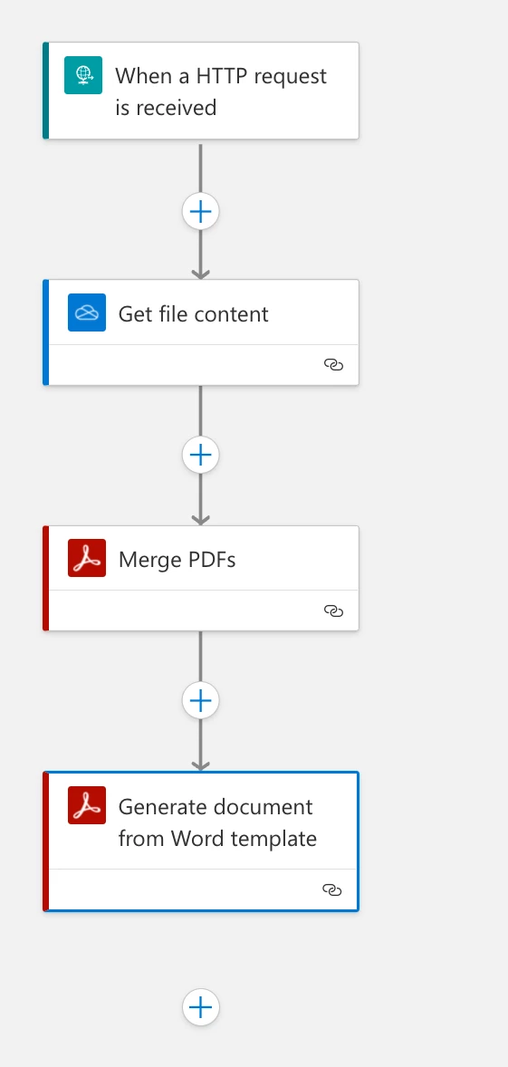 I have created a Logic App in Azure that collects PDFs in a array and will use "Merge PDFs"-action: