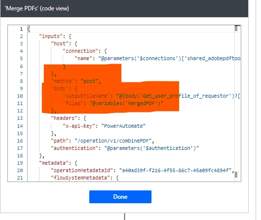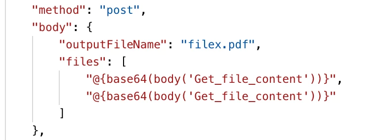 Below is some of the input that is sent to the "Merge PDFs"-action: