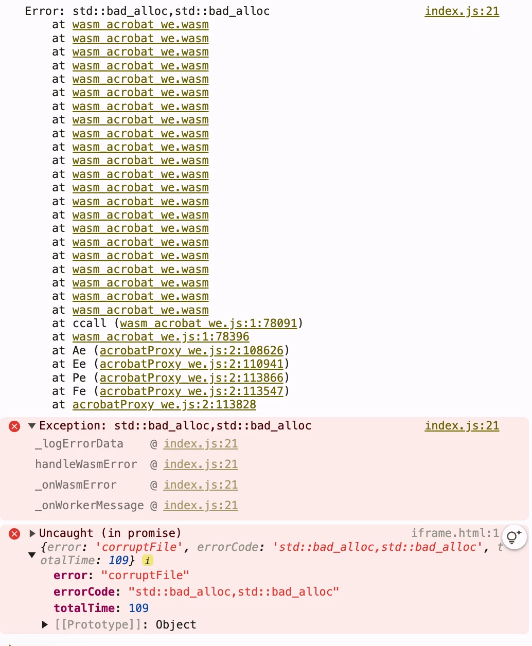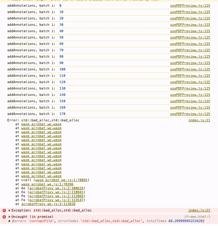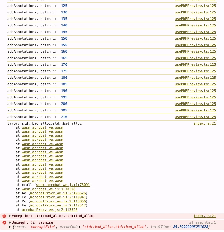 After loading the PDF viewer we call the annotation manager API's addAnnotations method. The promise eventually errors out with the following error (see image below) "Error: std::bad_alloc,std::bad_alloc", and we can see that some of the annotations have not been added.