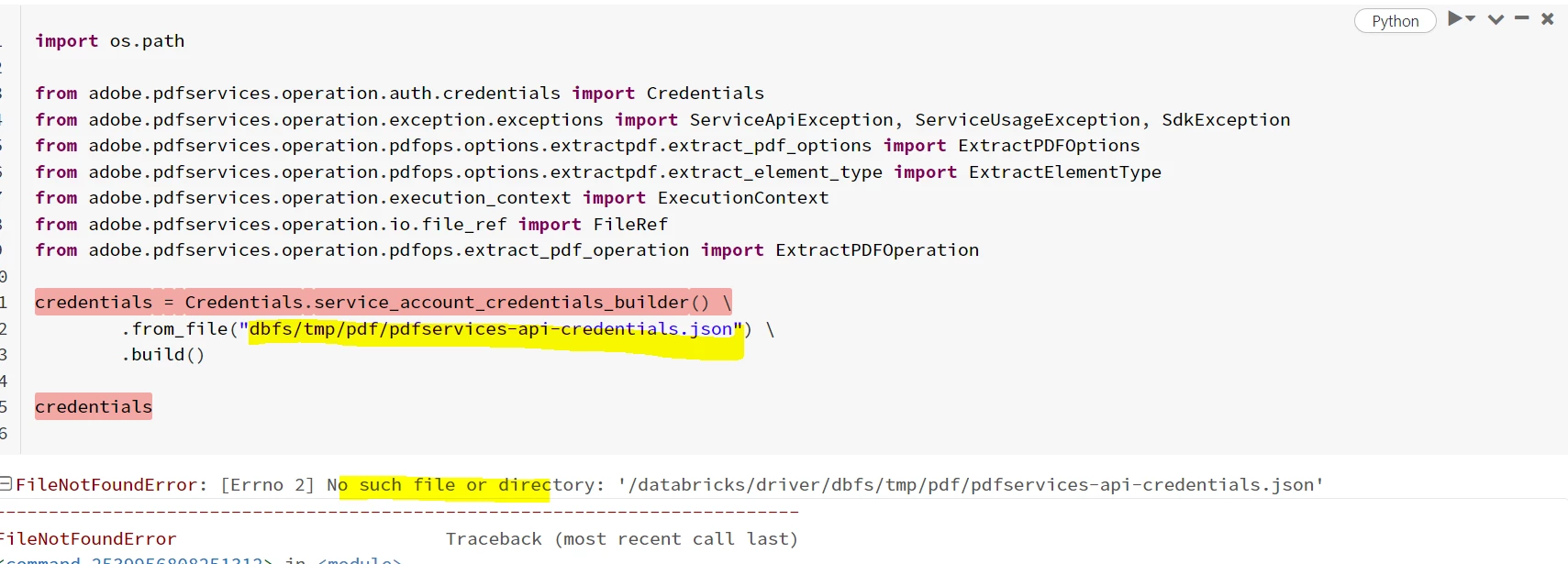 I'm trying to setup the sample code provided for PDF extract API service in databricks environment ( with just one driver node setup) but i'm unable to set the credential code which requires the path to api-credential.json its not able to read the path , please find the screen shot of the issue. Please help to setup the environment