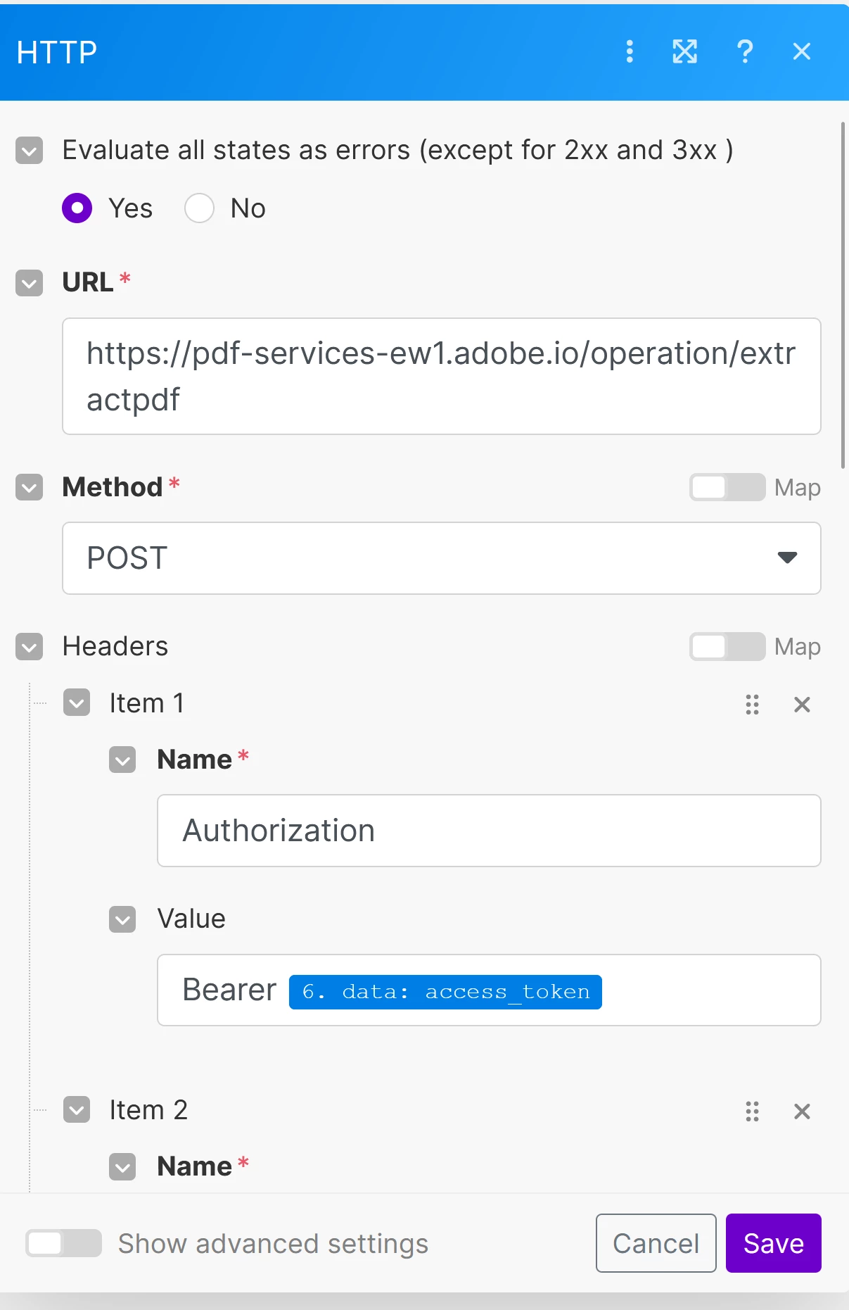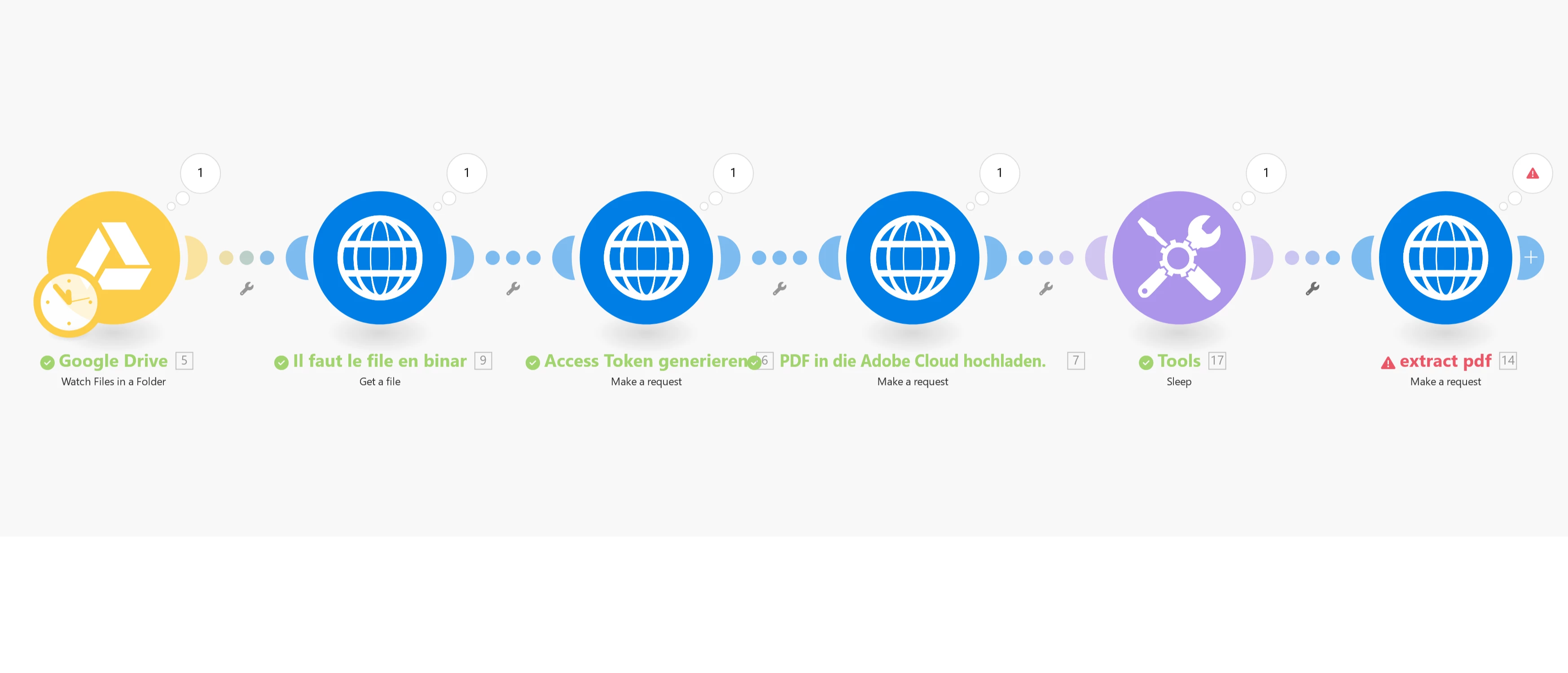 I’m trying to automate the process of extracting text from a PDF using make.com and the Adobe Services API. Here’s the sequence I’m following: